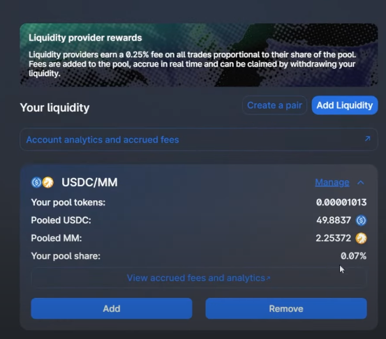 1. 进入QuickSwap,用借出来剩下USDC添加pool流动性,例如MM/USDC的pair;